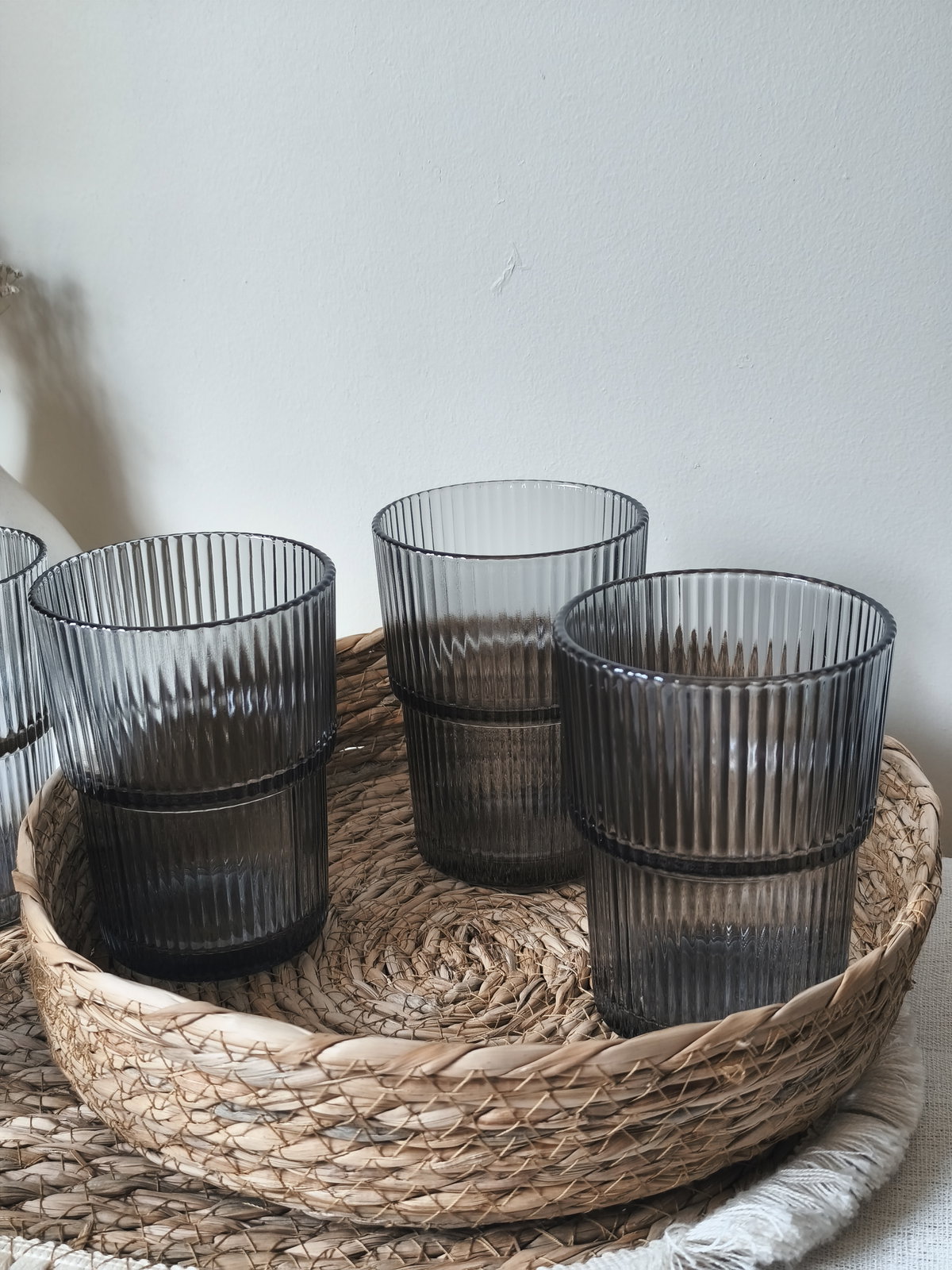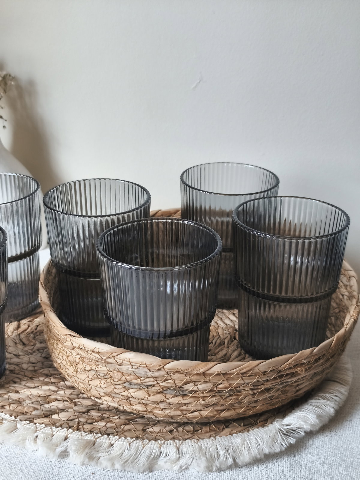 Set de 6 vasos vidrio labrado color humo . Son de vidrio grueso y con un atractivo diseño de Líneas. Dale un toque novedoso y original a tu mesa o terraza con este lindo Set de vasos. También puede ser un perfecto regalo.