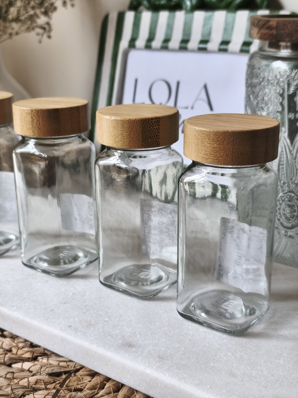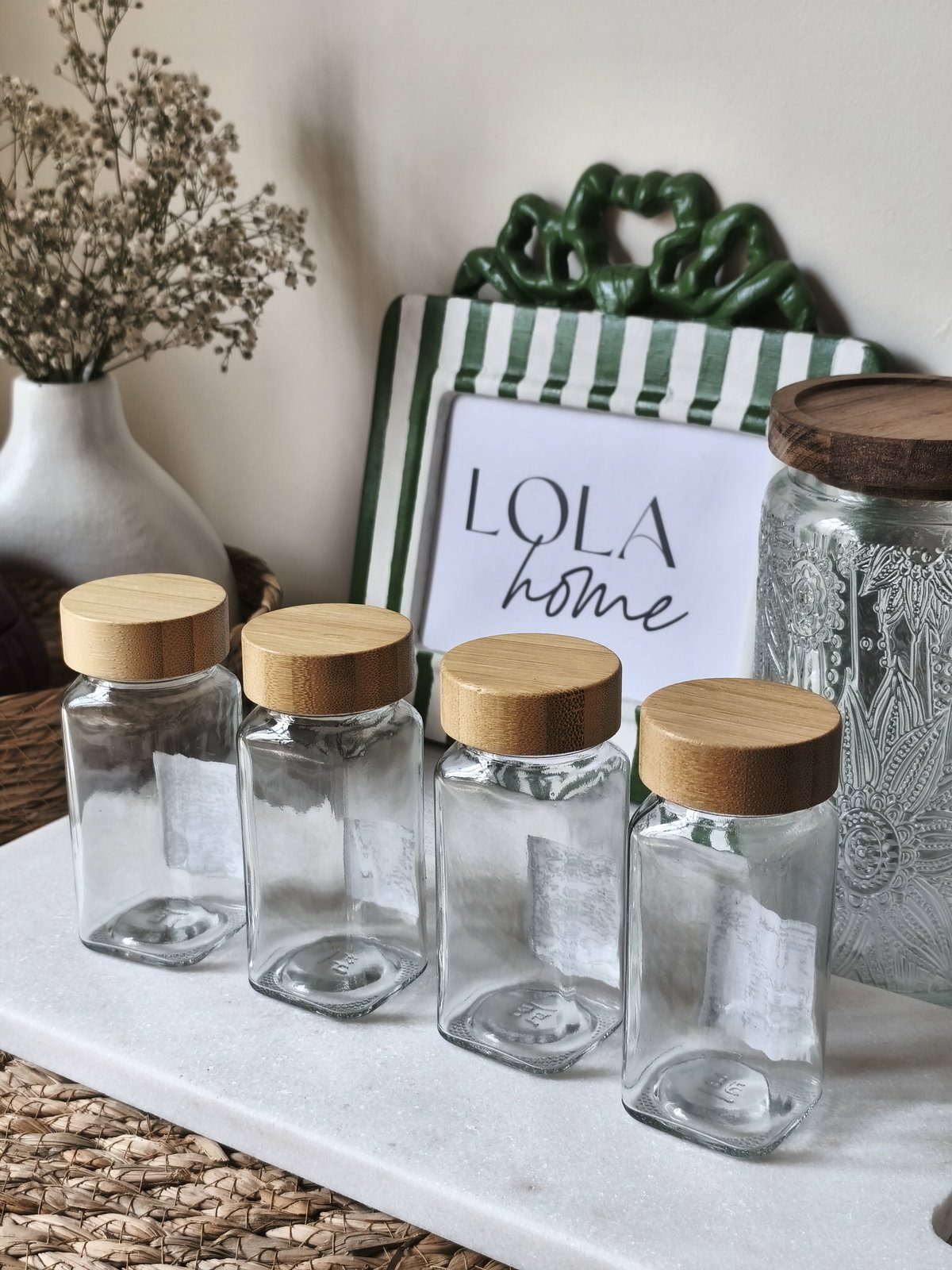 Set x 4 especieros de vidrio y tapa de bambú.