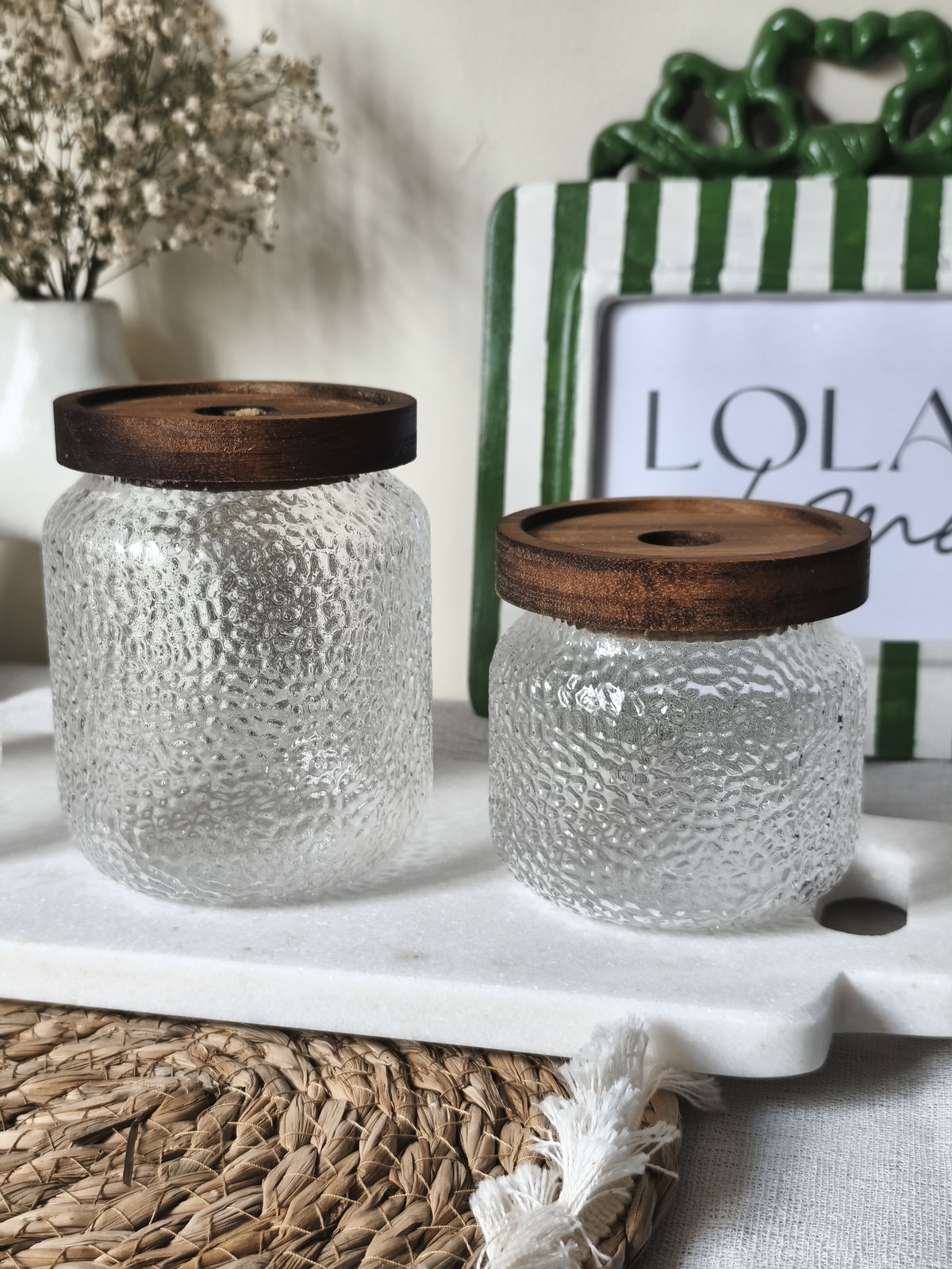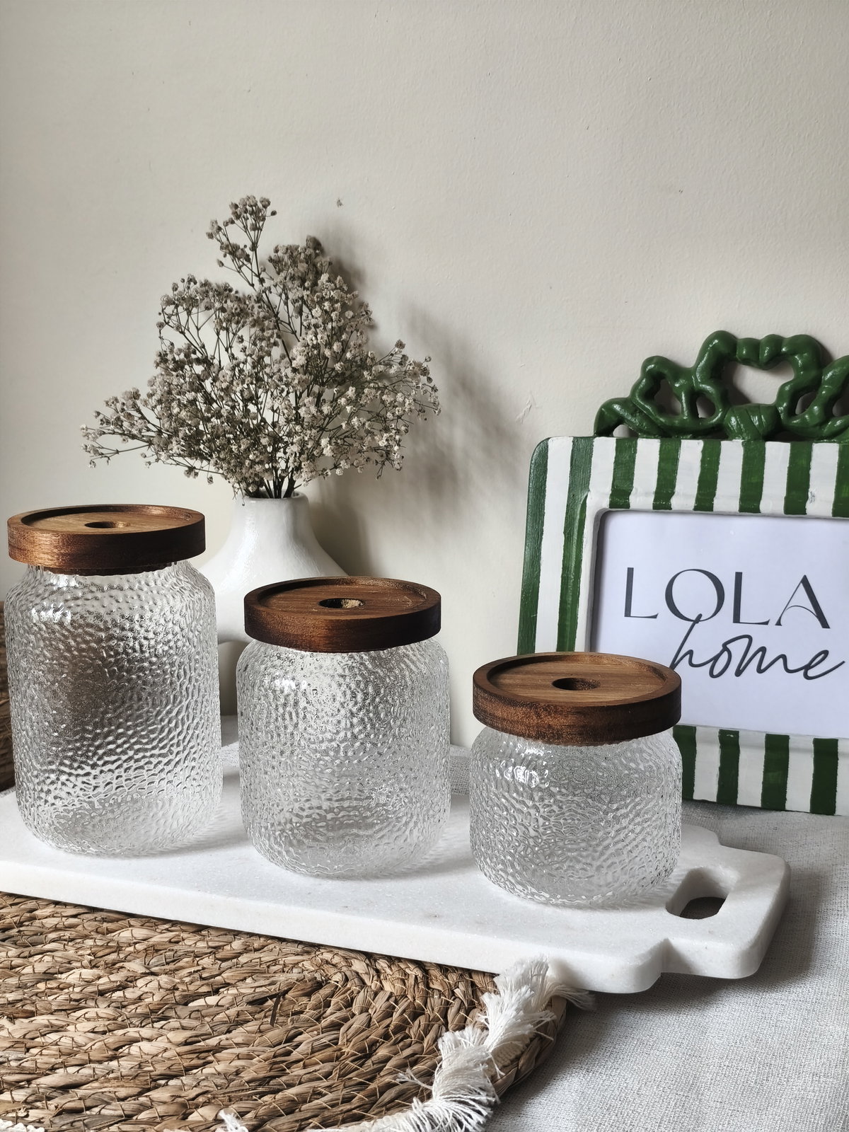 Set x3 frascos de vidrio con relieve y tapa de madera, ideales para almacenar y mantener frescos tus alimentos. Este Set combina funcionalidad y estilo para cualquier espacio de tu hogar.