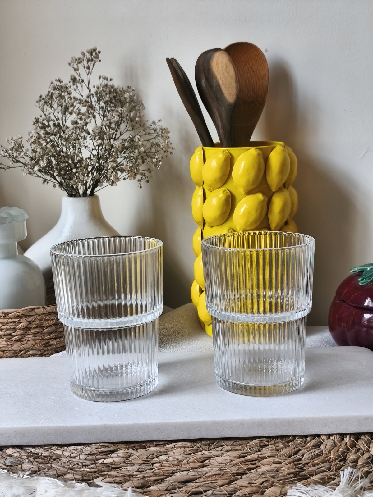 Set de 6 vasos vidrio labrado transparente . Son de vidrio grueso y con un atractivo diseño de Líneas. Dale un toque novedoso y original a tu mesa o terraza con este lindo Set de vasos. También puede ser un perfecto regalo.