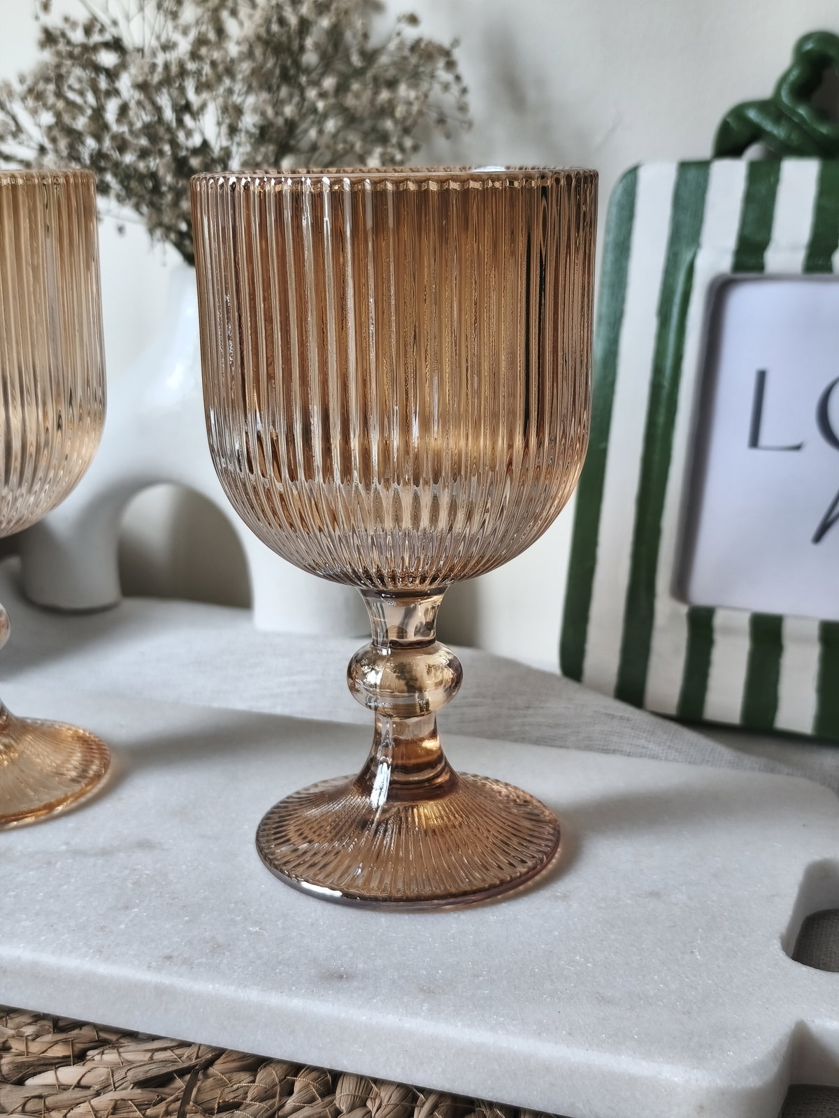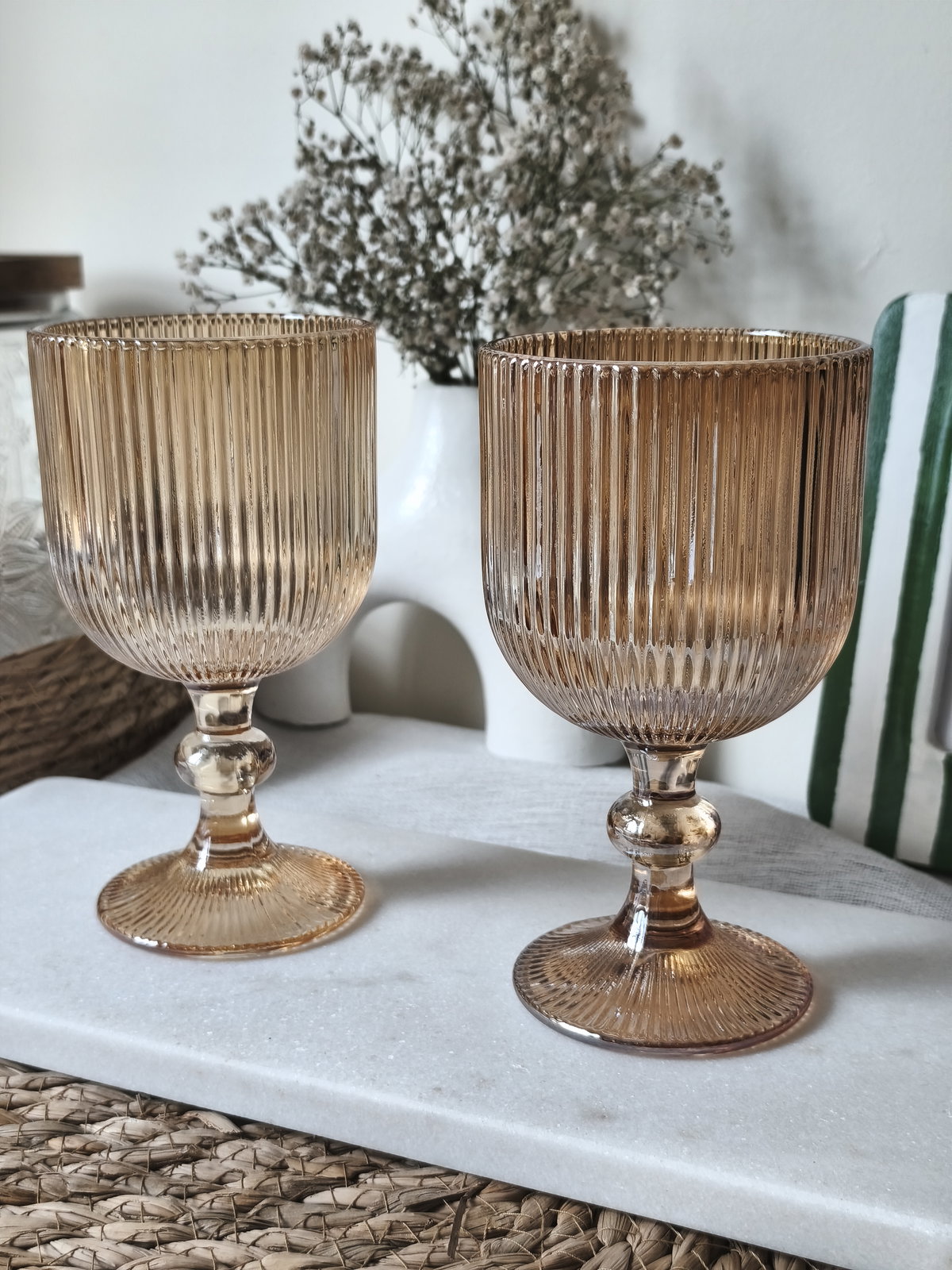 Set de 6 copas de vidrio labrado color dorado. Son de vidrio grueso y con un atractivo diseño de líneas. Dale un toque novedoso y original a tu mesa o terraza con este lindo Set de copas. También puede ser un perfecto regalo.