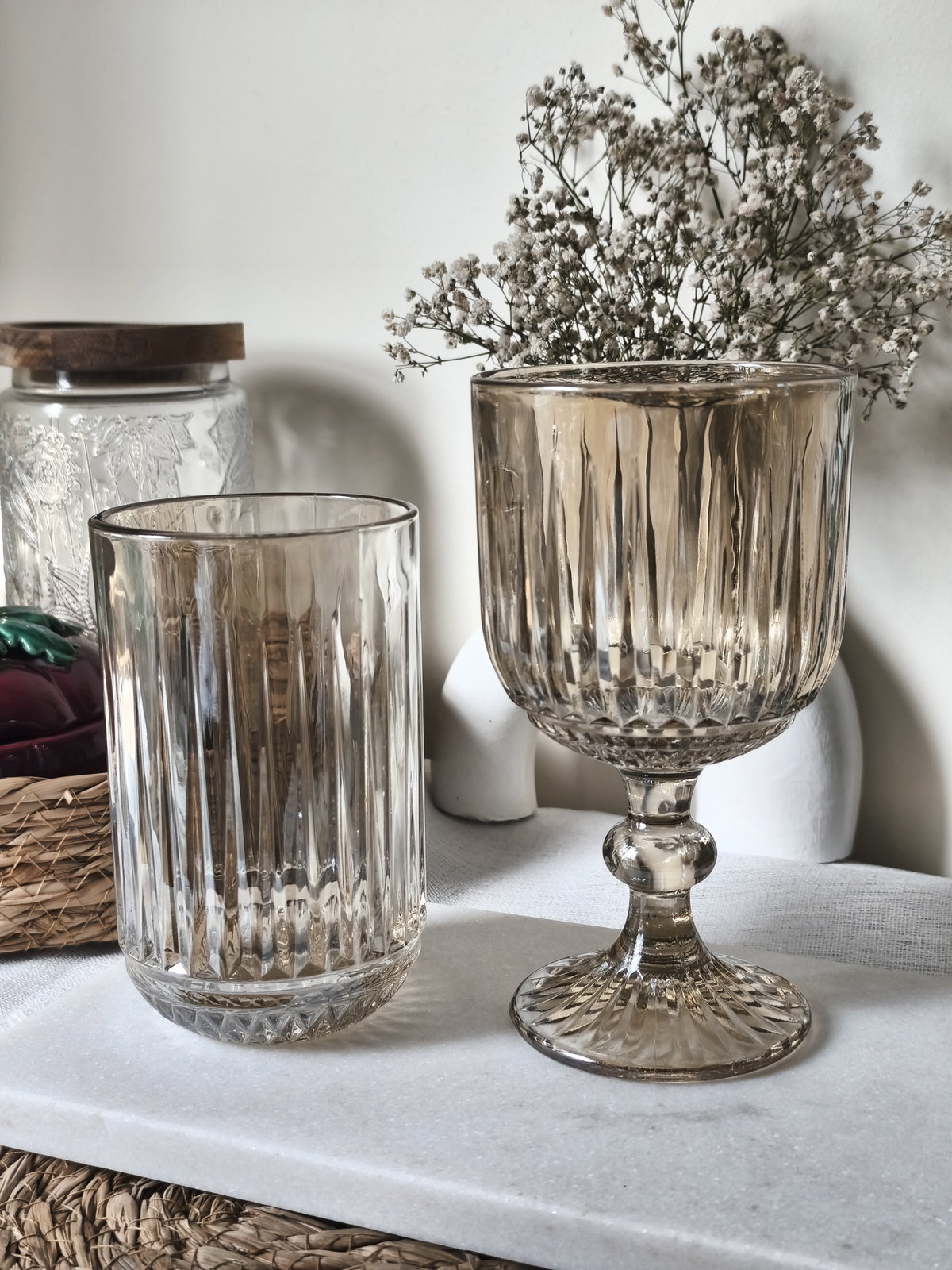 Set de 6 copas de vidrio labrado color champagne. Son de vidrio grueso y con un atractivo diseño de líneas en la base. Dale un toque novedoso y original a tu mesa o terraza con este lindo Set de copas. También puede ser un perfecto regalo.