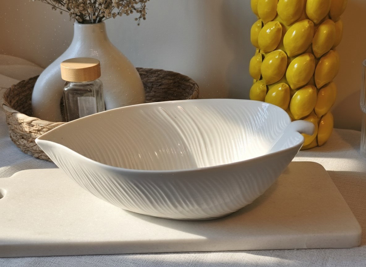 Dale un toque especial a tus comidas con nuestra ensaladera de porcelana en forma de hoja, que la hace ideal para servir distintos tipos de ensaladas, frutas o postres. Es de color blanca y combina fácilmente con cualquier estilo de vajilla, haciéndola perfecta para el uso diario o para ocasiones especiales.