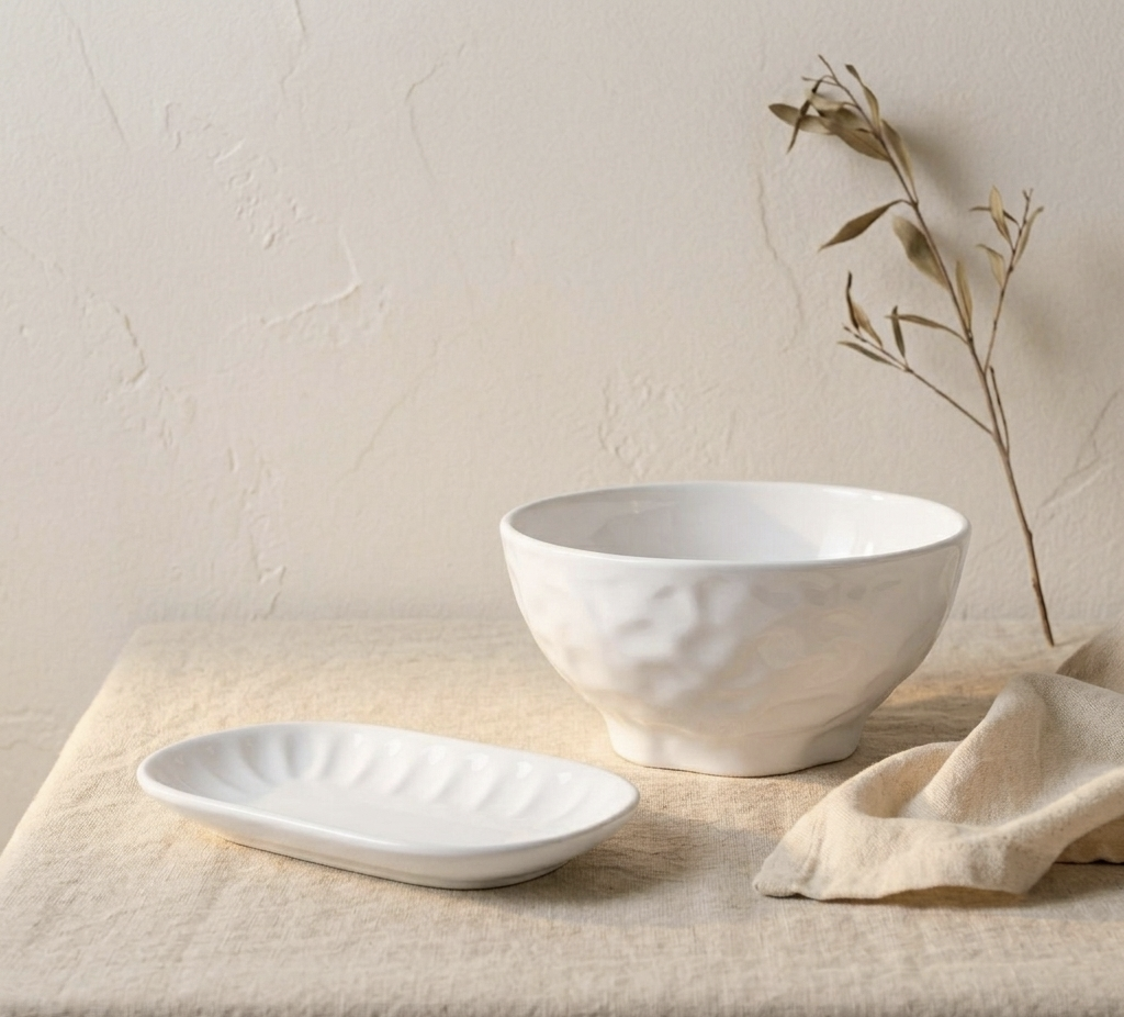 Dale un toque especial a tu mesa con este Set de cerámica Maldiva en color blanco con textura orgánica .El bowl es perfecto para servir ensaladas, como frutero, centro de mesa y la bandeja lista para picadas, sushi, budines o lo que quieras. Es un set versátil por lo que se puede adaptar fácilmente a cualquier vajilla. Incluye: